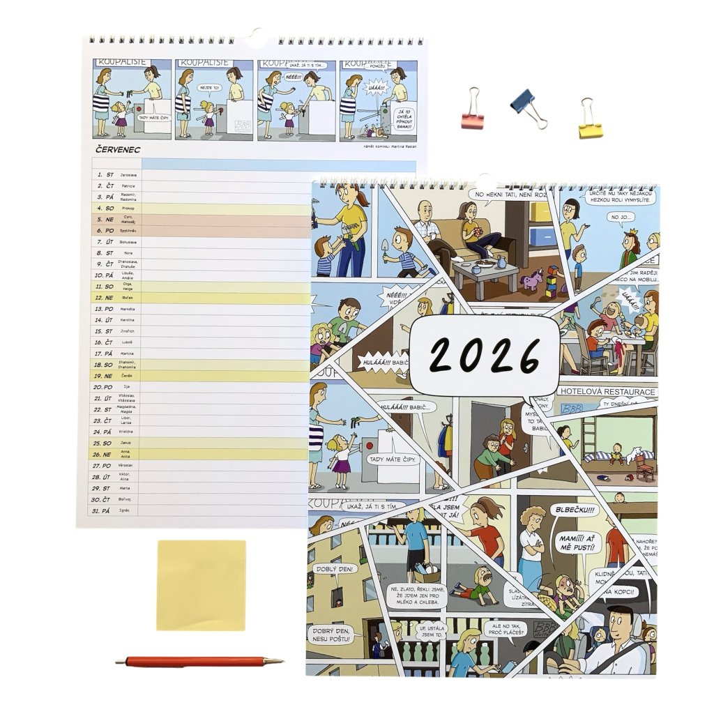 Velký rodinný nástěnný plánovací kalendář formátu A3 s komiksovými vtipy. Každý měsíc doprovází jeden veselý strip ze života s dětmi, ve kterém se dost možná poznáte ;-). Plánovací plochu si můžete rozdělit na libovolný počet sloupců podle počtu členů rodiny.