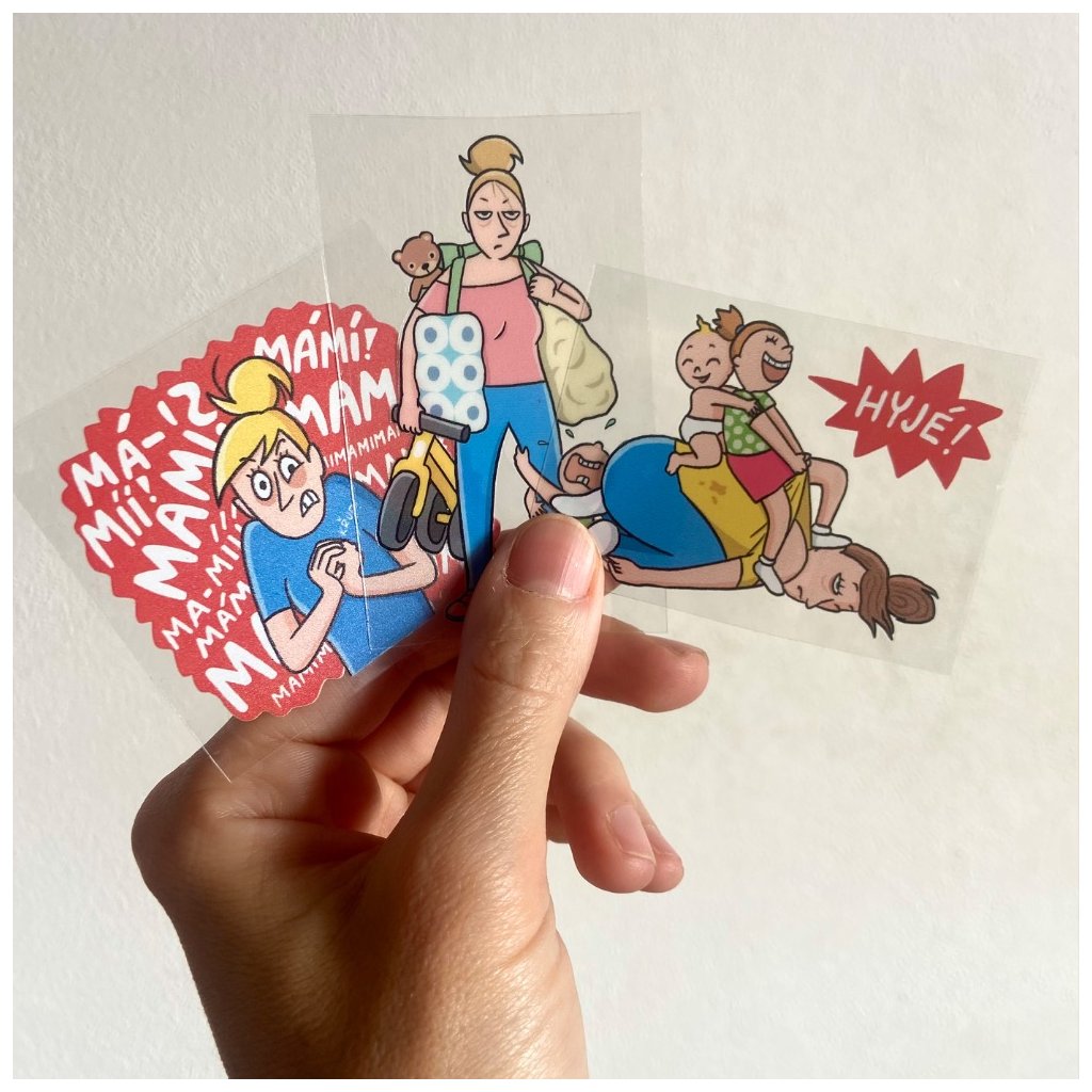 Do poznámky u objednávky nebo na info@bbb-ilutrace.cz mi napište váš výběr samolepky Mamí! (blond nebo bruneta) a Hyjé! (s chlapcem nebo holčičkou)